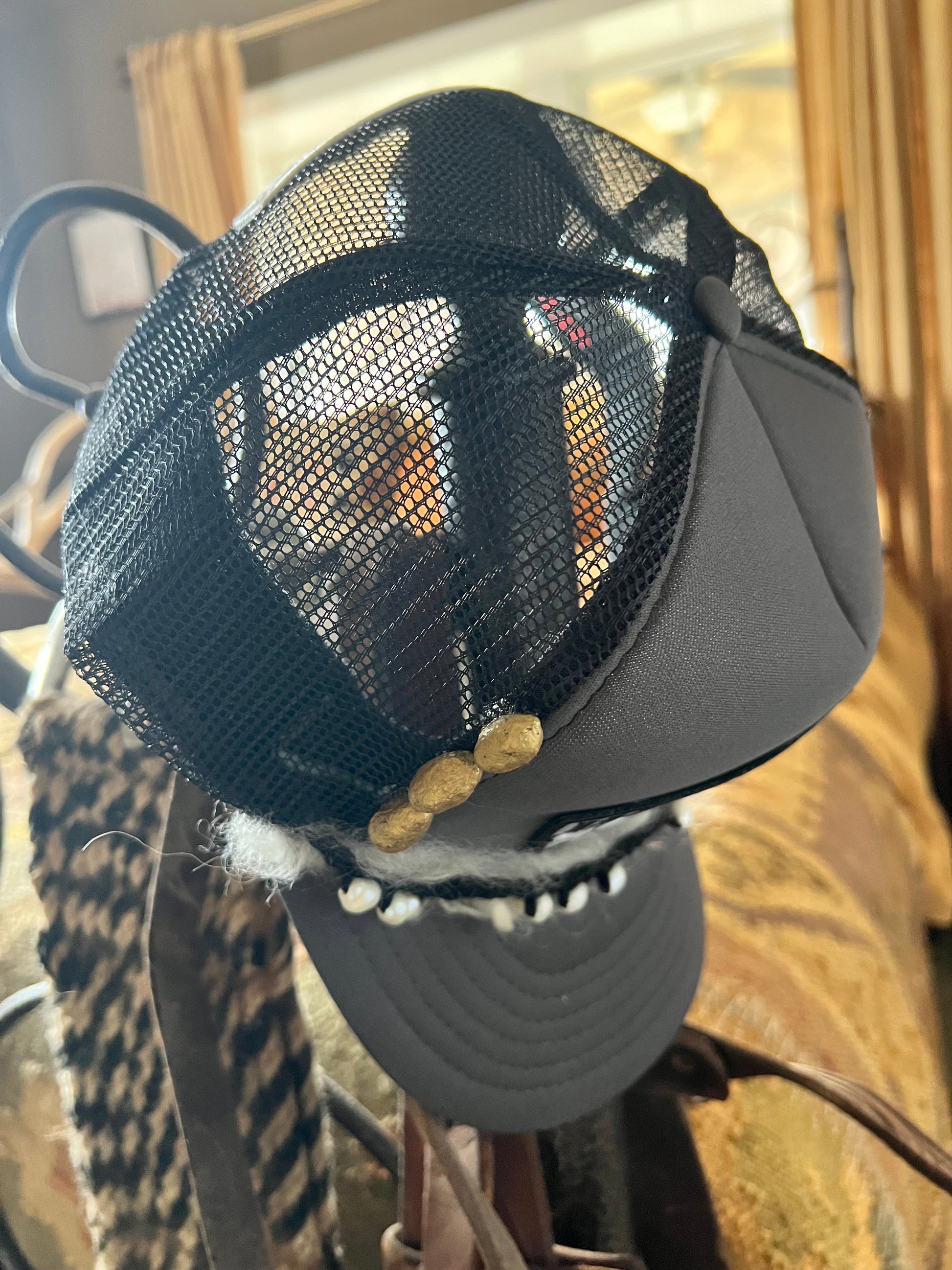 This special cap is embellished with a granny square I made from handspun wool and silk. Yes, I actually spun the wool and silk fibers on my spinning wheel like a dark ages maiden living in a castle. There is 100% real raw Finnsheep wool along the cap line from my ram, Huckleberry Finn, a crocheted strand of 100% natural freshwater pearls, two patches, one in front “Black Sheep”, and one in back “Real is Rare”. The pièce de résistance of the cap is 100% real handpicked in nature, dried gilded sheep…..uh…..”pellets”. Yes I’m for real. No I’m not kidding. The sheep pellets almost certainly came from my registered Tunis Ram, Icon, but there’s no way to know for sure as they were gathered in nature, along a ranch path, naturally “kiln dried” in the hot Texas sun.